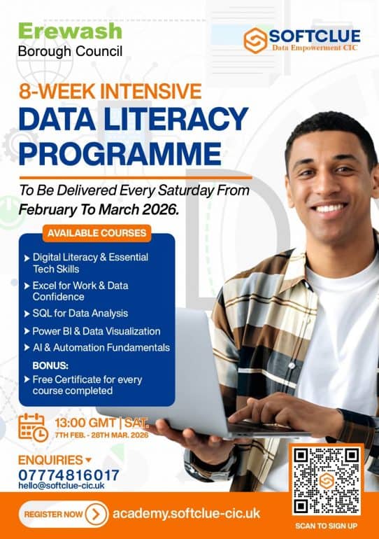 Starting on 7th February 2026, Softclue Data Empowerment CIC, a community-focused organisation, dedicated to empowering people with essential digital data skills, is offering an 8-week Digital Skills and Data Empowerment programme.