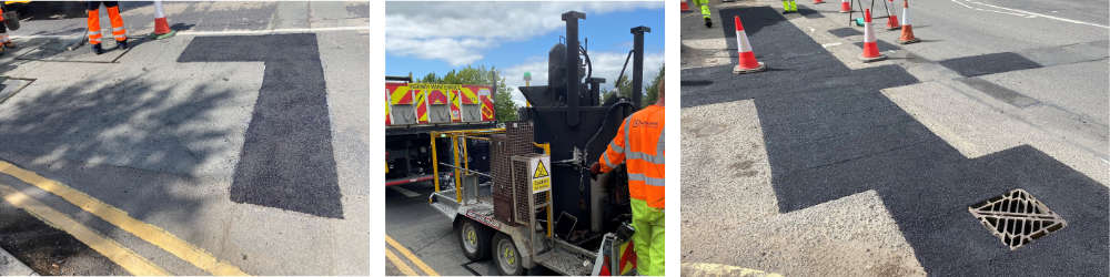 Using this method means there is no need to dig out the road or to seal the edges as it acts as a sealant and binds to the existing road surface, leaving a new waterproof top layer.
