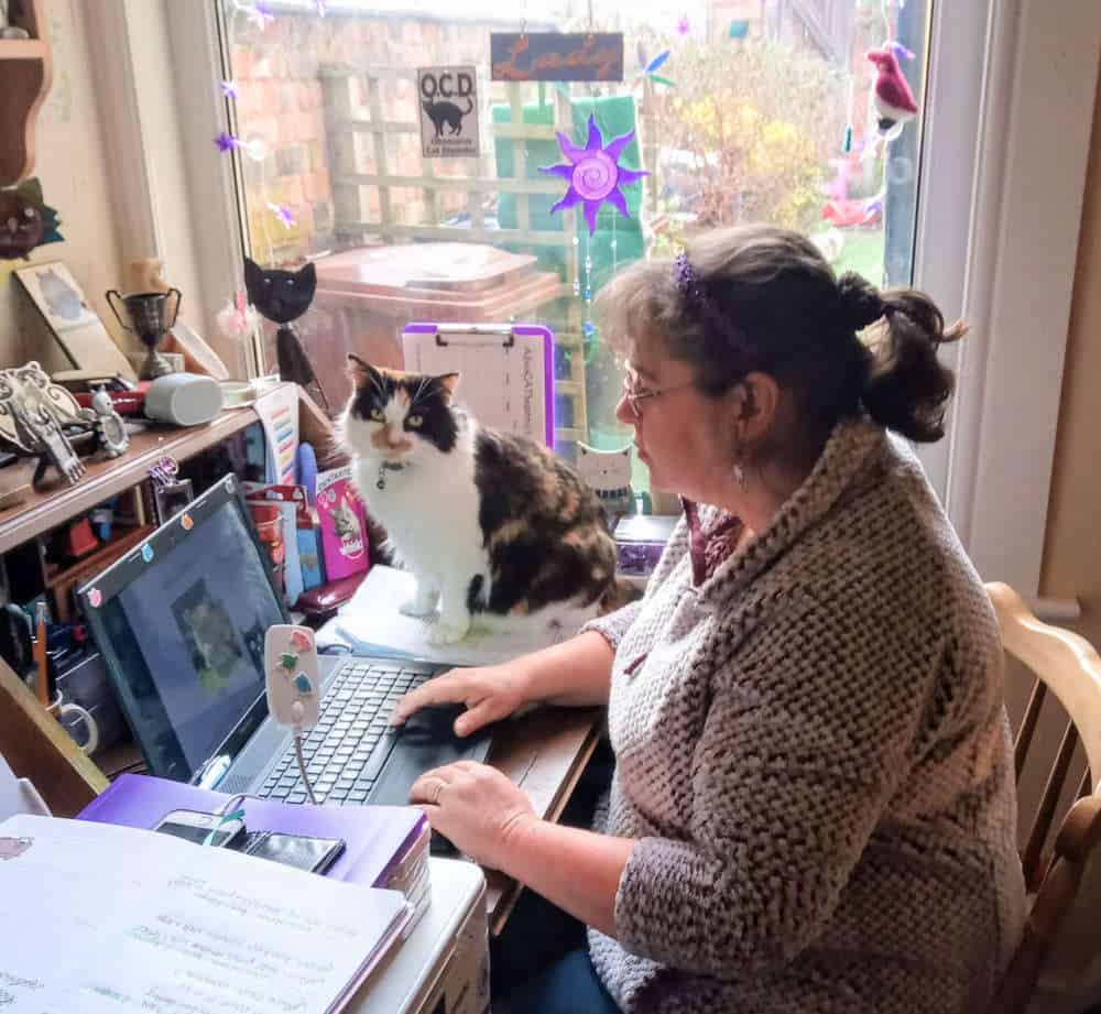 Jen in her home office with 'office assistant', her cat Mia