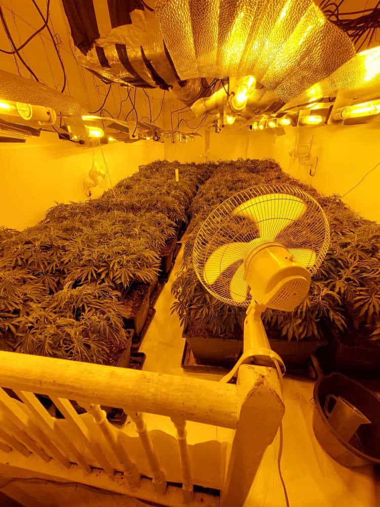 Two males aged 33 and 20 were arrested and a large-scale cannabis grow consisting of approximately 140 mature plants was seized as part of the investigation. Significant rewiring had been carried out to provide power for the illegal activities in an upper room of the property.