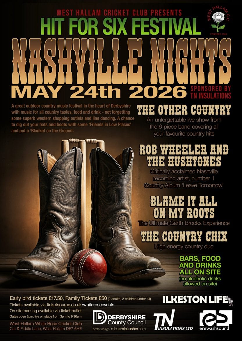 The Hit for Six Outdoor Festival – ‘Nashville Nights’ will be held at West Hallam White Rose Cricket Club, Cat & Fiddle Lane, West Hallam. DE7 5HE on Sunday 24th May 2026 from 2:00pm until 9:30pm and compered by Erewash Sound presenters.